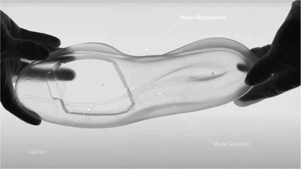 “氮?dú)獬R界物理發(fā)泡、一體成型,讓運(yùn)動(dòng)選手上場就能爆出好料”——這是安踏氮科技帶來的直觀表現(xiàn)!現(xiàn)場,安踏品牌鞋創(chuàng)新管理中心高級總監(jiān)蔡之本解讀了“動(dòng)創(chuàng)未來”這一主題,同時(shí)他還列舉了一組數(shù)據(jù)——氮科技加持下的材料實(shí)現(xiàn)能量回歸率高達(dá)86.8%,材料密度僅為0.09g/cm³,耐久性方面提升30%,綜合性能表現(xiàn)遠(yuǎn)高于同行。