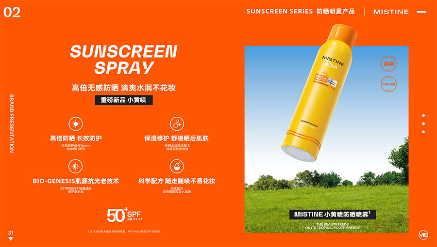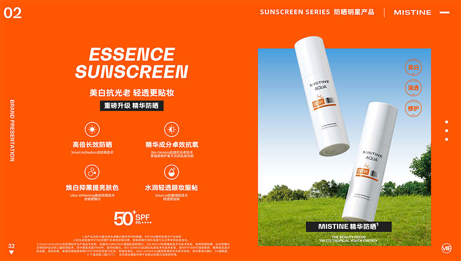 MISTINE蜜絲婷提出皮膚科學(xué)、前沿科技、靈魂成分、熱帶美學(xué)、卓越功效、保護(hù)環(huán)境六大品牌價(jià)值,致力于為全球女性提供豐富、安全、高品質(zhì)的美妝產(chǎn)品。基于MISTINE蜜絲婷品牌首席科學(xué)顧問——全球計(jì)算生物學(xué)權(quán)威之一、諾貝爾化學(xué)獎(jiǎng)得主Arieh Warshel的研究,MISTINE蜜絲婷創(chuàng)新防曬品類推出「光生物學(xué)」防曬系統(tǒng),提出“外層防護(hù)、中層修護(hù)和底層抗損”防曬新理念,引領(lǐng)防曬從“表面防護(hù)”進(jìn)入“深度抗光老”新時(shí)代。同時(shí),MISTINE蜜絲婷還持續(xù)深耕專業(yè)彩妝市場,以熱帶美學(xué)基因造就產(chǎn)品防水防汗、高倍耐曬、長效持妝的優(yōu)勢,圍繞消費(fèi)者需求打造多元化的產(chǎn)品矩陣,引領(lǐng)防曬、底妝賽道發(fā)展。