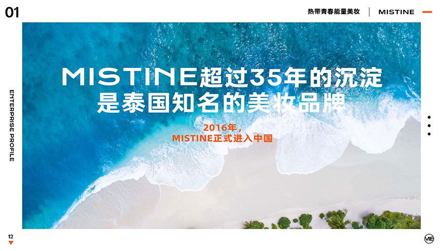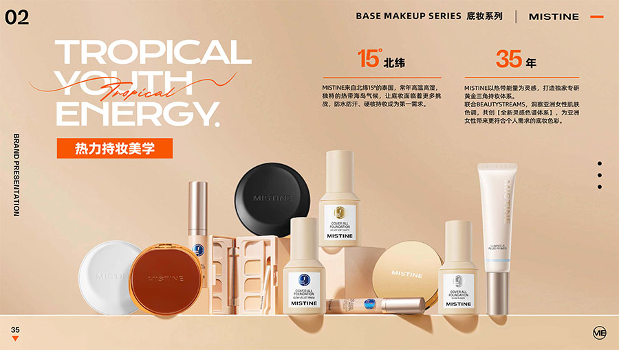 MISTINE蜜絲婷1988年始源于泰國,作為知名國際美妝品牌,擁有超過35年的科研底蘊(yùn),產(chǎn)品種類涵蓋防曬、美妝、護(hù)膚、香水、個(gè)護(hù)五大類,擁有近6000多個(gè)單品暢銷全球20多個(gè)國家,專注為全球女性提供豐富、安全、高品質(zhì)的美妝產(chǎn)品。自2016年進(jìn)入中國后,MISTINE蜜絲婷以“熱帶青春能量美妝”為品牌定位,為年輕人打造更懂得他們的全新美妝產(chǎn)品,并傳遞獨(dú)特的健康活力生活方式。