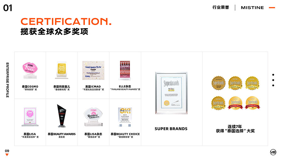 36年來,MISTINE蜜絲婷步履不停,堅(jiān)持從消費(fèi)者出發(fā),以優(yōu)質(zhì)專研產(chǎn)品、適時(shí)而動的渠道策略和持續(xù)發(fā)力的品牌塑造,贏得眾多消費(fèi)者的喜愛和行業(yè)內(nèi)外的贊許。迄今,MISTINE蜜絲婷已連續(xù)七年攬獲“泰國選擇”大獎(jiǎng),同時(shí)先后榮獲中國化妝品大會藍(lán)玫獎(jiǎng)「2022年度競爭力品牌」、IQF國際品質(zhì)節(jié)暨消費(fèi)領(lǐng)導(dǎo)力峰會「杰出消費(fèi)影響力品牌」、CAQI中國質(zhì)量網(wǎng)「全國美妝行業(yè)質(zhì)量領(lǐng)先品牌」、天貓金妝獎(jiǎng)超級單品「年度防曬獎(jiǎng)」、凱度消費(fèi)者指數(shù)「極具成長力品牌」等榮譽(yù)。