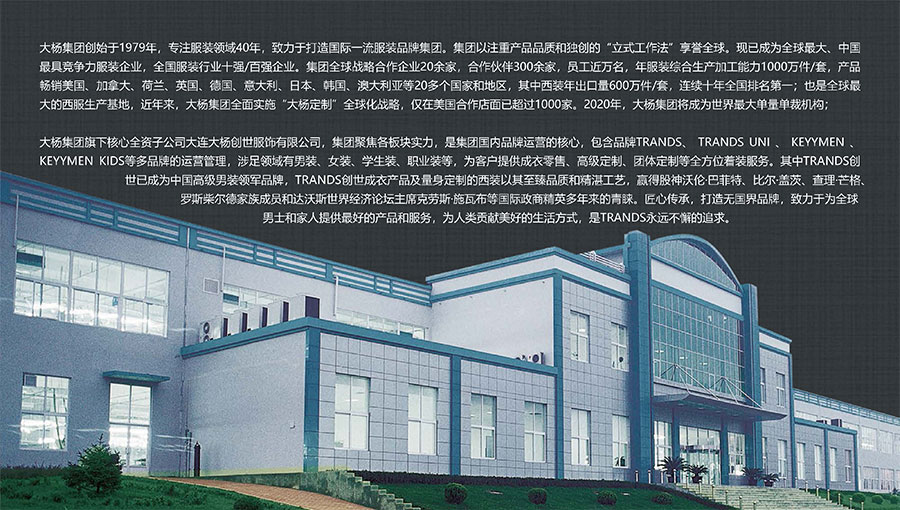 大楊集團創(chuàng)建于1979年,總部位于遼寧省大連市,主要生產(chǎn)和銷售各類中高檔服裝產(chǎn)品為主的國際化大型服裝企業(yè),以西裝縫制享譽全球,是世界重要的西裝生產(chǎn)加工基地?,F(xiàn)有直屬(控股)成員企業(yè)20家,員工4500人??毓勺庸敬筮B大楊創(chuàng)世股份有限公司2000年在上海證券交易所上市,并于2016年完成重大資產(chǎn)重組。
