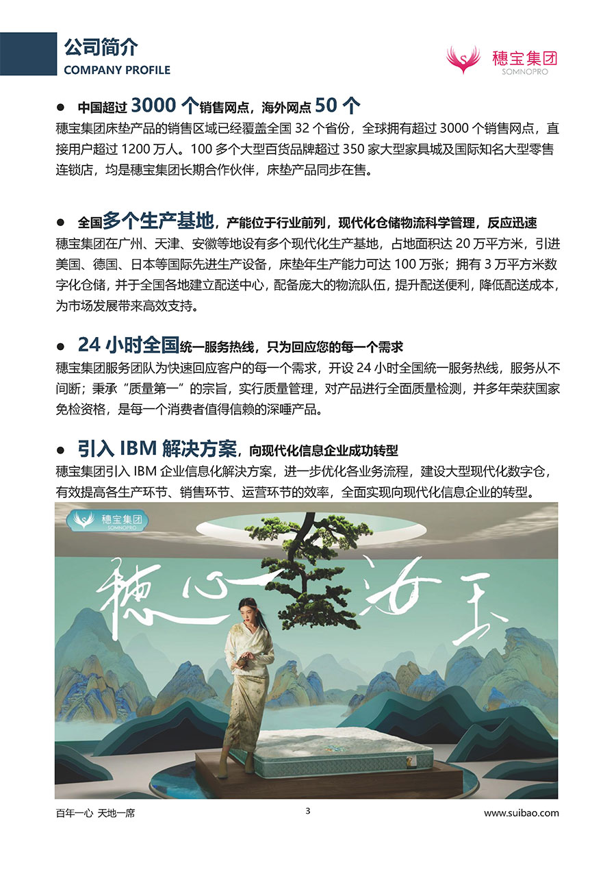半個(gè)世紀(jì)的付出,穗寶集團(tuán)在深度睡眠領(lǐng)域收獲非凡成就,贏得業(yè)界與社會(huì)的一致贊譽(yù)。作為大家居行業(yè)的品質(zhì)倡導(dǎo)者,穗寶集團(tuán)不斷創(chuàng)新,豐富品牌實(shí)力,致力推動(dòng)中國(guó)床墊產(chǎn)業(yè)發(fā)展。至今,穗寶集團(tuán)旗下?lián)碛卸鄠€(gè)來(lái)自世界各地的優(yōu)質(zhì)品牌,包括:穗寶、詩(shī)貝艾爾、百納璐詩(shī)、睡客小鎮(zhèn)、Mr.Z早先生等;此外,穗寶集團(tuán)從世界各地甄選適合不同消費(fèi)者的優(yōu)質(zhì)睡眠產(chǎn)品,定制屬于您的睡眠空間。如今,穗寶集團(tuán)形成以研發(fā)、生產(chǎn)和銷售床墊為主營(yíng)業(yè)務(wù),涉及家具、家居裝飾、酒店配套等多項(xiàng)業(yè)務(wù)的企業(yè)群體。
