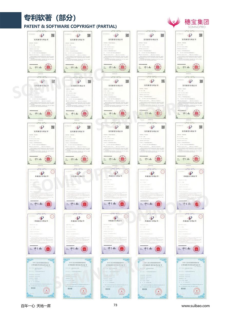 穗寶集團(tuán)遍訪全球,深度整合世界優(yōu)質(zhì)資源,專注睡眠研究,與世界家具材料行業(yè)領(lǐng)導(dǎo)者禮恩派集團(tuán)結(jié)成戰(zhàn)略伙伴,成立睡眠研究中心和彈簧網(wǎng)檢測(cè)中心,引入床墊鋪面耐久性測(cè)試儀,材料拉力測(cè)試儀,床墊撓度曲線測(cè)試儀,為產(chǎn)品注入優(yōu)秀基因;成功研發(fā)推出IFEEL深睡感知系統(tǒng)、X7研發(fā)系統(tǒng),關(guān)注消費(fèi)者每一個(gè)細(xì)微的睡眠需求,致力于以科學(xué)的方式創(chuàng)造優(yōu)異的物理與心理助眠條件,幫助現(xiàn)代人獲得優(yōu)質(zhì)深度睡眠;不斷創(chuàng)新進(jìn)取,軀位步技術(shù)、T-GUARD衡力支承系統(tǒng)等多項(xiàng)成果獲國(guó)內(nèi)國(guó)際專利。
