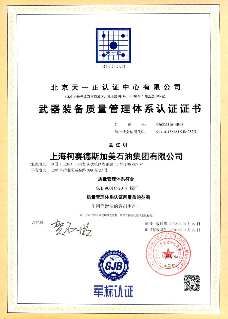 柯賽德斯集團(tuán)公司統(tǒng)一遵循嚴(yán)格的質(zhì)量保證體系,先后通過了武器裝備質(zhì)量管理體系認(rèn)證GJB9001C-2017、ISO/TS16949、IS09001質(zhì)量體系認(rèn)證、1S014001環(huán)境體系認(rèn)證及ISO45001:2018職業(yè)健康安全管理體系認(rèn)證。隨著業(yè)務(wù)領(lǐng)域的不斷擴(kuò)展,目前柯賽德斯集團(tuán)公司先后與多家世界能源、化工方面的巨頭建立了產(chǎn)品服務(wù)、供應(yīng)保障、技術(shù)合作、技術(shù)特別支持單位等方面的戰(zhàn)略合作關(guān)系。今天,柯賽德斯集團(tuán)公司旗下管理著三大潤滑油品牌,實現(xiàn)了經(jīng)營上的多元化戰(zhàn)略格局。