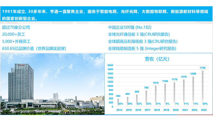 江蘇亨通電力電纜有限公司是亨通集團(tuán)旗下的一家國家級重點(diǎn)高新技術(shù)企業(yè),注冊商標(biāo)“亨通光電”,注冊資金185168萬元,成立于1995年,目前員工總數(shù)為一千余人。可以研發(fā)制造220kV及以下交聯(lián)電力電纜、防火電纜、光纖復(fù)合電纜、光伏電纜、鋁合金電纜、電氣裝備電纜、控制電纜、低壓電線等產(chǎn)品,可滿足電力、通信、交通、冶金、石油石化、煤炭、船舶、軍工等不同行業(yè)、地區(qū)和國家客戶的差異化需求。