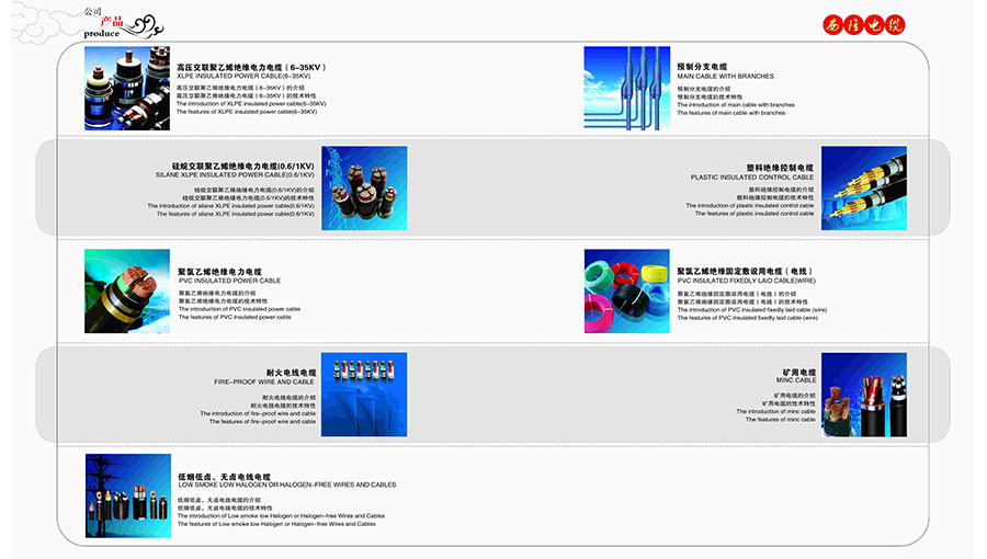 西隆電纜主要產品:高低壓電力電纜(阻燃、耐火、耐寒、耐高溫、低煙無鹵、低煙低鹵、輻照交聯(lián)、預分支、電氣化鐵道電纜等)、架空絕緣導線(含耐候架空導線、集束平行導線、ABC架空導線)、架空裸導線(含鋼芯鋁絞線、鋁絞線、鋁合金絞線、鋁包鋼芯鋁絞線等)、電線(民用電線、戶外耐候線)、控制電纜、橡套電纜、礦用阻燃電纜、硅橡膠電纜、計算機電纜、光伏專用電纜、鋁合金電力電纜、氟塑料電纜等。