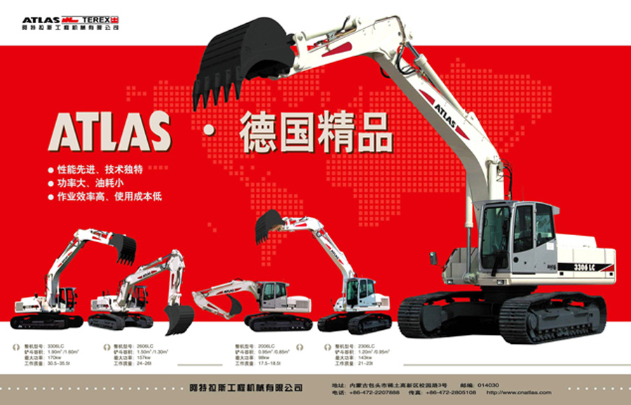 中國阿特拉斯是高新技術(shù)企業(yè),主要生產(chǎn)和銷售具有世界先進(jìn)水平的ATLAS 20噸級(jí)以上中大型及礦用挖掘機(jī)。該系列挖掘機(jī)具有“性能先進(jìn)、技術(shù)獨(dú)特;功率大、油耗小;作業(yè)效率高、使用成本低”的突出特點(diǎn),可廣泛應(yīng)用于礦山開采及城鄉(xiāng)建設(shè)。