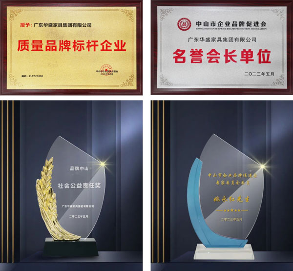 華盛家具集團憑借卓越的品牌實力獲頒“質(zhì)量品牌標桿企業(yè)”、“品牌中山社會公益責(zé)任獎”、“名譽會長單位”榮譽稱號,同時,姚永紅董事長獲聘“中山市企業(yè)品牌促進會專家委員會委員”。