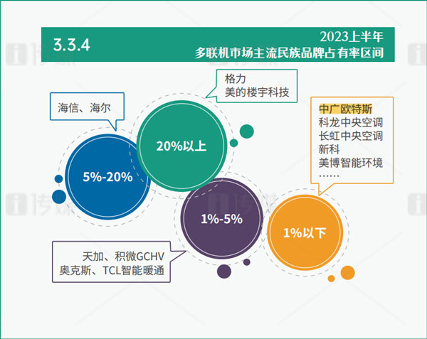 作為中央空調(diào)市場的絕對權(quán)重品類,多聯(lián)機一直以來都能以一己之力決定行業(yè)的風(fēng)向,而2023上半年,多聯(lián)機市場的走勢與行業(yè)大勢卻呈現(xiàn)相悖的局面,下滑4.2%。其下滑走勢的原因與房產(chǎn)經(jīng)濟走勢緊密相關(guān)。在品牌陣營上,國產(chǎn)陣營、歐美陣營以及日韓陣營組成了中國中央空調(diào)行業(yè)的三大陣容,且愈發(fā)穩(wěn)固。其中,國產(chǎn)陣營穩(wěn)穩(wěn)占據(jù)著超過一半的市場份額,擁有后發(fā)優(yōu)勢的中廣歐特斯通過兩年時間的沖刺,已在其中占有一席之地。