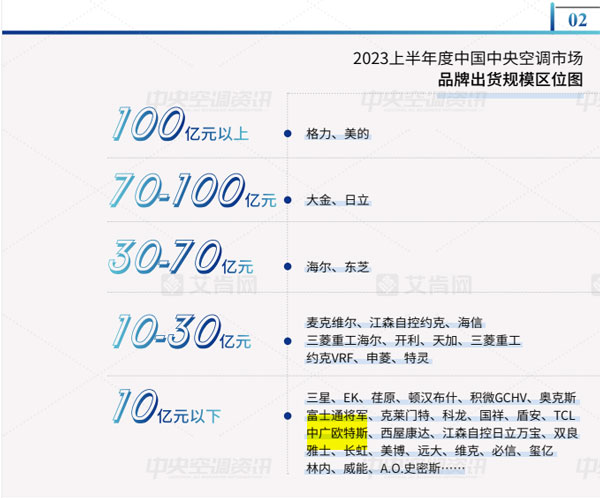 經(jīng)過多年的發(fā)展,中國中央空調(diào)市場的品牌格局基本穩(wěn)定。結(jié)合2023上半年各品牌的市場表現(xiàn),該報告將品牌出貨規(guī)模區(qū)位分為5大陣營,其中,中廣歐特斯在10億元以下規(guī)模榜上有名。
