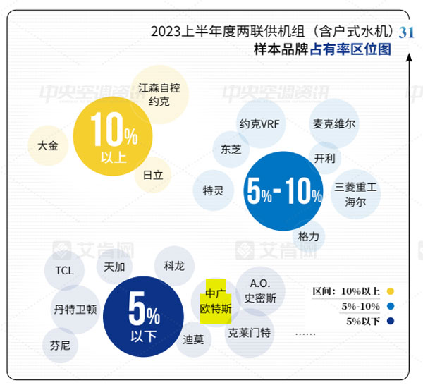 2023上半年,中廣歐特斯在渠道推廣和產(chǎn)品研發(fā)上不斷發(fā)力,兩聯(lián)供機組市場開拓取得了一定的成績,并在2023上半年度兩聯(lián)供機組(含戶式水機)樣本品牌占有率上展示出一定的表現(xiàn)力,與科龍中央空調(diào)、天加、TCL智能暖通等國貨品牌并肩前行,占有率均為5%以下。