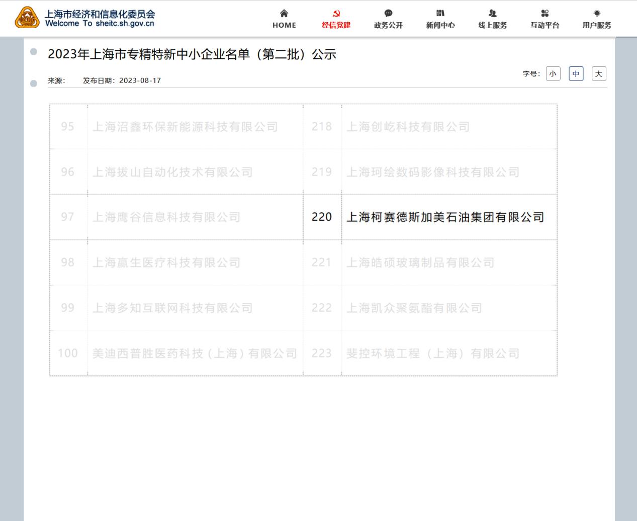 日前,從上海市經(jīng)濟和信息化委員官方網(wǎng)站發(fā)布的資訊顯示,2023年上海市專精特新中小企業(yè)名單(第二批)已經(jīng)公示,位于中國(上海)自貿(mào)區(qū)的上海柯賽德斯加美石油集團有限公司進入公示名單。