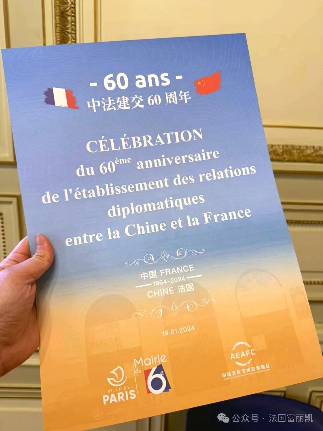 1月27日是中法建交60周年紀(jì)念日,日前由中法文化藝術(shù)交流協(xié)會(huì)(AEAFC)主辦的慶祝中法建交60周年文藝演出在巴黎6區(qū)政府禮堂舉行。巴黎6區(qū)政府、中國(guó)駐法使館等相關(guān)政府工作人員、歐洲時(shí)報(bào)、全球公益聯(lián)盟等組織負(fù)責(zé)人等出席活動(dòng),共話(huà)新時(shí)期大國(guó)友誼的現(xiàn)實(shí)意義及長(zhǎng)遠(yuǎn)影響。60周年、巴黎6區(qū),也寄寓著對(duì)中法交往六六大順的期盼。