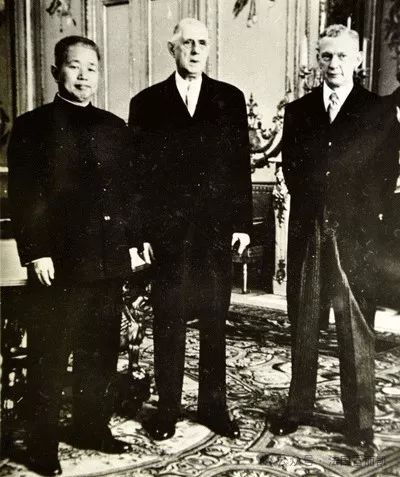 左為中國(guó)首任駐法大使黃鎮(zhèn),中為時(shí)任法國(guó)總統(tǒng)戴高樂(lè)將軍。