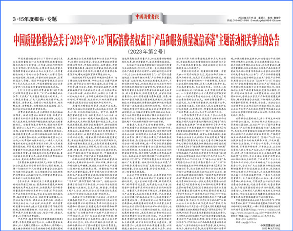 中國(guó)經(jīng)濟(jì)網(wǎng)北京3月15日訊(記者 佟明彪 蘇蘭) 春來(lái)潮涌,奮楫揚(yáng)帆。在2023年“3·15”國(guó)際消費(fèi)者權(quán)益日到來(lái)之際,中國(guó)質(zhì)量檢驗(yàn)協(xié)會(huì)(以下簡(jiǎn)稱質(zhì)檢協(xié)會(huì))組織開(kāi)展2023年“3·15”“產(chǎn)品和服務(wù)質(zhì)量誠(chéng)信承諾”主題活動(dòng),包括中國(guó)航天科技、格力、美的、紅九九、名臣健康、安莉芳等各行各業(yè)2000多家優(yōu)秀企業(yè)積極響應(yīng)參與,在推動(dòng)經(jīng)營(yíng)者質(zhì)量誠(chéng)信自律、維護(hù)消費(fèi)者合法權(quán)益、持續(xù)優(yōu)化營(yíng)商環(huán)境等方面展現(xiàn)了質(zhì)量領(lǐng)域社團(tuán)組織在新時(shí)代的新作用。