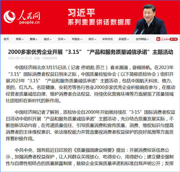 中國(guó)經(jīng)濟(jì)網(wǎng):2000多家優(yōu)秀企業(yè)開(kāi)展“3·15”“產(chǎn)品和服務(wù)質(zhì)量誠(chéng)信承諾”主題活動(dòng)