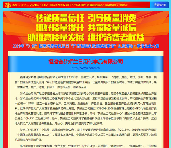 引導質(zhì)量消費,共筑質(zhì)量誠信,3月15日,由中國質(zhì)量檢驗協(xié)會主辦的2021年“3.15”產(chǎn)品和服務質(zhì)量誠信承諾的主題活動如期舉行,小浣熊作為“3.15”產(chǎn)品和服務質(zhì)量誠信承諾企業(yè),憑借匠心的品質(zhì)、優(yōu)質(zhì)的服務及良好的口碑,獲得協(xié)會以及權(quán)威專家的一致認可,榮獲“全國產(chǎn)品和服務質(zhì)量誠信示范企業(yè)”,“全國質(zhì)量誠信先進企業(yè)”、“全國質(zhì)量信譽保障產(chǎn)品”、“全國日化行業(yè)質(zhì)量領(lǐng)先品牌” 等多項榮譽,《中國質(zhì)量報》、《中國消費者報》及中國質(zhì)量網(wǎng)、中國經(jīng)濟網(wǎng)、中國消費網(wǎng)等多家媒體均予以集中展示和公告。