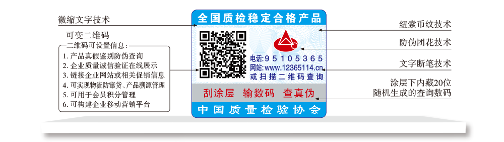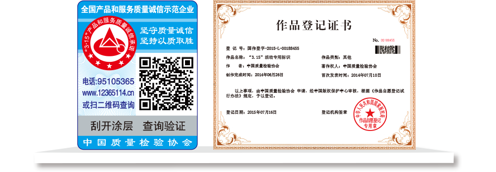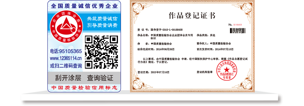 【“全國質檢穩(wěn)定合格產品”專用標識】具有專屬的知識產權(經中國版權保護中心審核,國家版權局對“全國質檢穩(wěn)定合格產品”專用標識頒發(fā)了《作品登記證書》,登記號:國作登字-2015-L-00188456),基本規(guī)格為5cm2,集電話電碼防偽查詢、二維碼在線掃描、微信驗證等多種功能于一體,綜合運用了紐索幣紋、微縮文字、熒光激發(fā)油墨等多種防偽技術;專用標識加貼在產品或包裝上,消費者只需要用座機(手機)電話撥打全國范圍內都不需要加區(qū)號的特服號碼95105365或使用手機掃描二維碼或登陸網站(http://www.12365114.cn)就可直接查詢驗證加貼專用標識的產品為中國質量檢驗協(xié)會調查匯總證明的全國質量檢驗穩(wěn)定合格產品,助力企業(yè)通過“質量檢驗”的比較優(yōu)勢去贏得消費者更多的信任,形成企業(yè)自己獨有的比較優(yōu)勢。