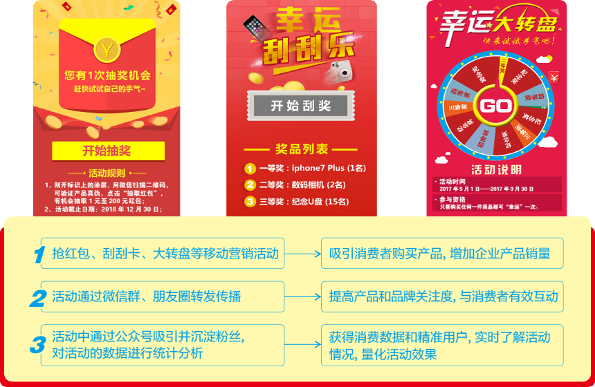 消費者購買企業(yè)的產品后,掃描標識上的二維碼,參與企業(yè)設置的搶紅包、刮刮卡、大轉盤等營銷互動活動,中獎后直接進入微信公眾號領取,操作簡單方便,在實現企業(yè)促進產品銷售的同時,還可增加企業(yè)微信公眾號的粉絲數量;同時,充分利用移動互聯(lián)網易于傳播的特性,實現企業(yè)品牌的廣泛傳播,采用多種移動創(chuàng)新營銷方式,結合數據統(tǒng)計分析,幫助企業(yè)實現精準營銷;另外,通過抽獎、助力、積分兌換等主流營銷活動,吸引、刺激消費者持續(xù)消費、分享傳播,進而有效提高企業(yè)的產品銷量;還有,也可針對企業(yè)某一種產品進行單獨促銷開展營銷活動,消費者掃描二維碼參與營銷互動活動,輕松實現促銷之目的,收集營銷活動數據,借助大數據分析,分析消費者的特征、分布、消費習慣等信息,引導企業(yè)的市場營銷戰(zhàn)略和銷售策略,使企業(yè)營銷舉措更加精準有效。