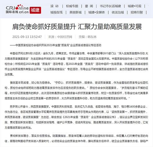 中國(guó)經(jīng)濟(jì)網(wǎng):堅(jiān)持質(zhì)量第一 抓好質(zhì)量提升 共筑質(zhì)量誠(chéng)信 建設(shè)質(zhì)量強(qiáng)國(guó)——2021年全國(guó)“質(zhì)量月”企業(yè)質(zhì)量誠(chéng)信倡議書(shū)