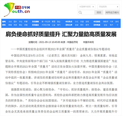 中國(guó)青年網(wǎng):肩負(fù)使命抓好質(zhì)量提升 匯聚力量助高質(zhì)量發(fā)展——中國(guó)質(zhì)量檢驗(yàn)協(xié)會(huì)組織開(kāi)展2021年全國(guó)"質(zhì)量月"企業(yè)質(zhì)量誠(chéng)信倡議專(zhuān)題活動(dòng)