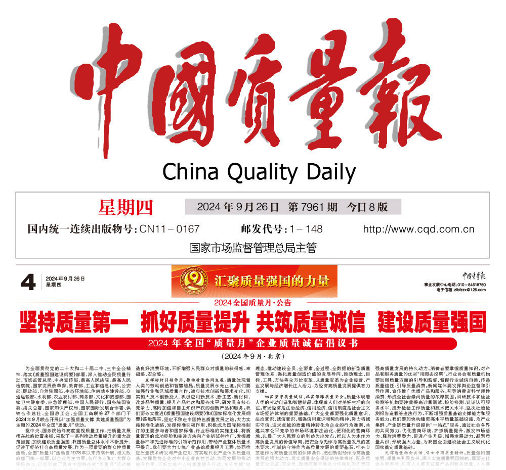 - 中國(guó)質(zhì)量報(bào)—匯聚力量攜手抓好質(zhì)量提升 肩負(fù)使命推進(jìn)質(zhì)量強(qiáng)國(guó)建設(shè)——2024年全國(guó)“質(zhì)量月”企業(yè)質(zhì)量誠(chéng)信倡議活動(dòng)取得顯著成效