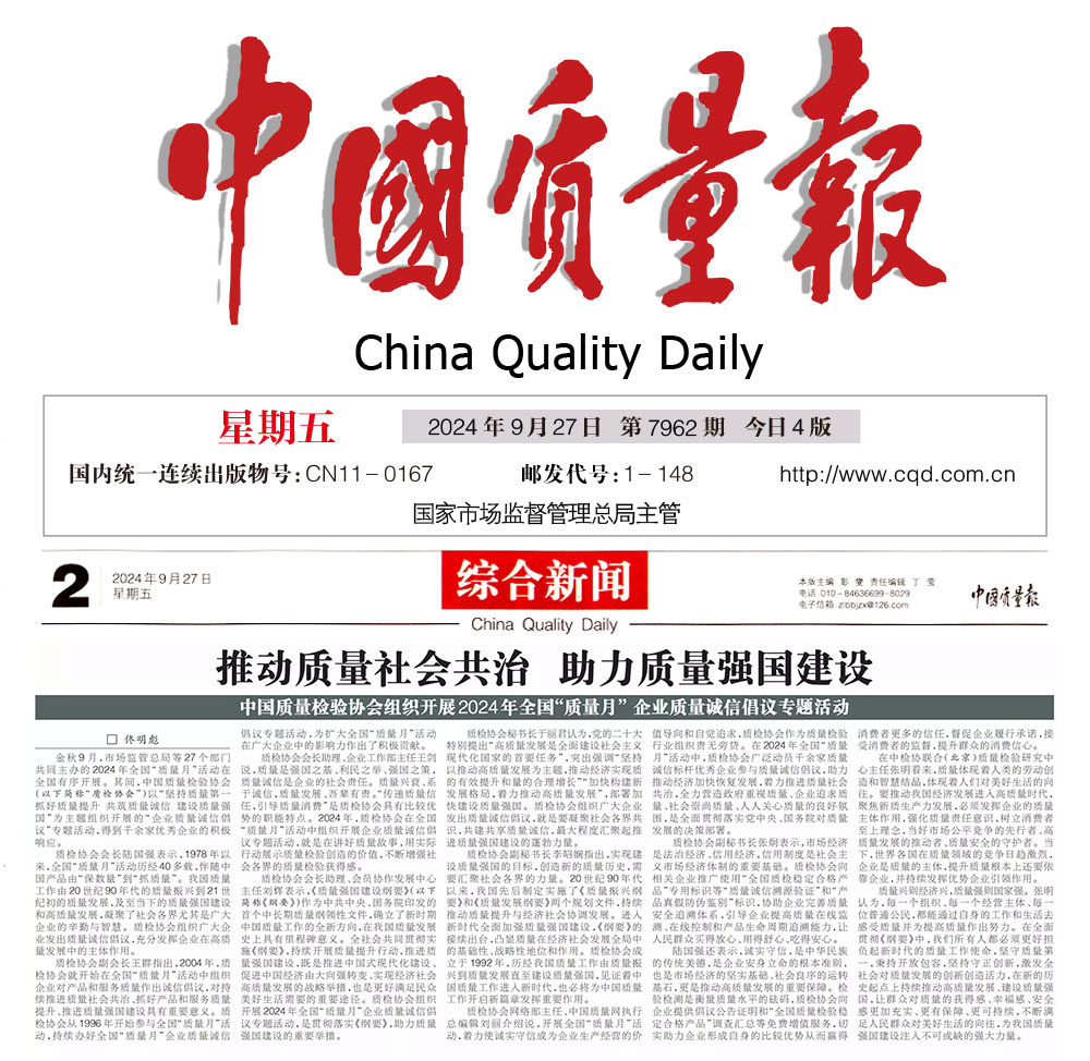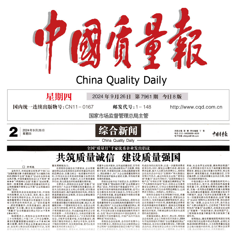 - 中國(guó)質(zhì)量報(bào)—堅(jiān)持質(zhì)量第一推動(dòng)質(zhì)量社會(huì)共治 助力質(zhì)量強(qiáng)國(guó)建設(shè)——中國(guó)質(zhì)量檢驗(yàn)協(xié)會(huì)組織開(kāi)展2024年全國(guó)“質(zhì)量月” 企業(yè)質(zhì)量誠(chéng)信倡議專題活動(dòng)