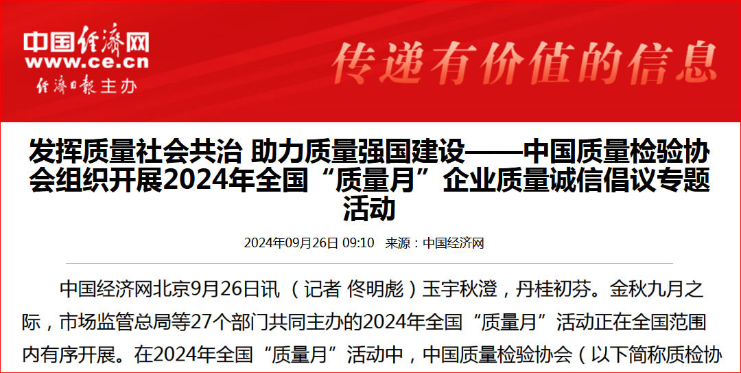 - 中國(guó)經(jīng)濟(jì)網(wǎng)—發(fā)揮質(zhì)量社會(huì)共治 助力質(zhì)量強(qiáng)國(guó)建設(shè)——中國(guó)質(zhì)量檢驗(yàn)協(xié)會(huì)組織開(kāi)展2024年全國(guó)“質(zhì)量月”企業(yè)質(zhì)量誠(chéng)信倡議專題活動(dòng)