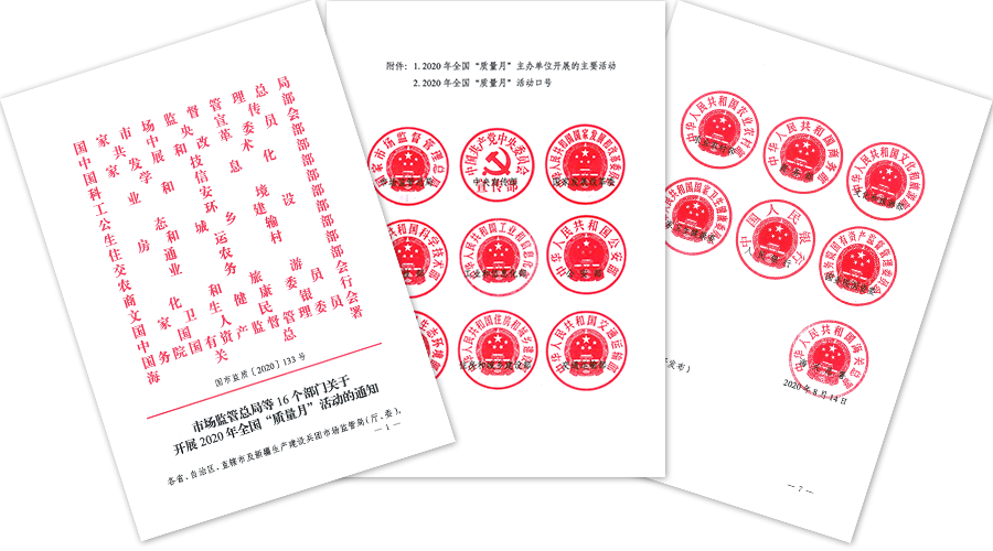 市場(chǎng)監(jiān)管總局、中央宣傳部、國家發(fā)展改革委、科技部、工業(yè)和信息化部等2020年全國“質(zhì)量月”活動(dòng)主辦單位在《市場(chǎng)監(jiān)管總局等16個(gè)部門關(guān)于開展2020年全國“質(zhì)量月”活動(dòng)的通知》(國市監(jiān)質(zhì)〔2020〕133號(hào))中明確指出:為深入學(xué)習(xí)貫徹習(xí)近平新時(shí)代中國特色社會(huì)主義思想和黨的十九大精神,認(rèn)真落實(shí)黨中央、國務(wù)院關(guān)于質(zhì)量工作的重大決策部署,做好“六穩(wěn)”工作、落實(shí)“六?!比蝿?wù),切實(shí)維護(hù)市場(chǎng)秩序,著力優(yōu)化營商環(huán)境,全面提升產(chǎn)品、工程和服務(wù)質(zhì)量,為建設(shè)質(zhì)量強(qiáng)國、決勝全面建成小康社會(huì)提供有力支撐,市場(chǎng)監(jiān)管總局等16個(gè)部門定于2020年9月聯(lián)合開展全國“質(zhì)量月”活動(dòng)。