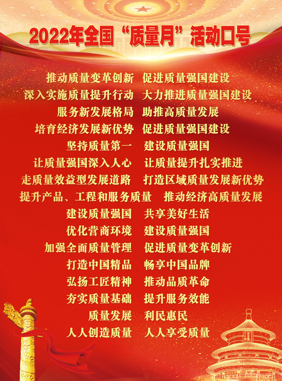 為深入貫徹習(xí)近平新時(shí)代中國特色社會(huì)主義思想,全面落實(shí)黨的十九大和十九屆歷次全會(huì)精神,立足新發(fā)展階段,完整、準(zhǔn)確、全面貫徹新發(fā)展理念,構(gòu)建新發(fā)展格局,樹立質(zhì)量第一的強(qiáng)烈意識(shí),大力提升各行業(yè)質(zhì)量水平,推動(dòng)經(jīng)濟(jì)加快發(fā)展,促進(jìn)質(zhì)量強(qiáng)國建設(shè),以實(shí)際行動(dòng)迎接黨的二十大勝利召開,市場監(jiān)管總局等21個(gè)部門定于2022年9月聯(lián)合開展以“推動(dòng)質(zhì)量變革創(chuàng)新 促進(jìn)質(zhì)量強(qiáng)國建設(shè)”為主題的2022年全國“質(zhì)量月”活動(dòng)。